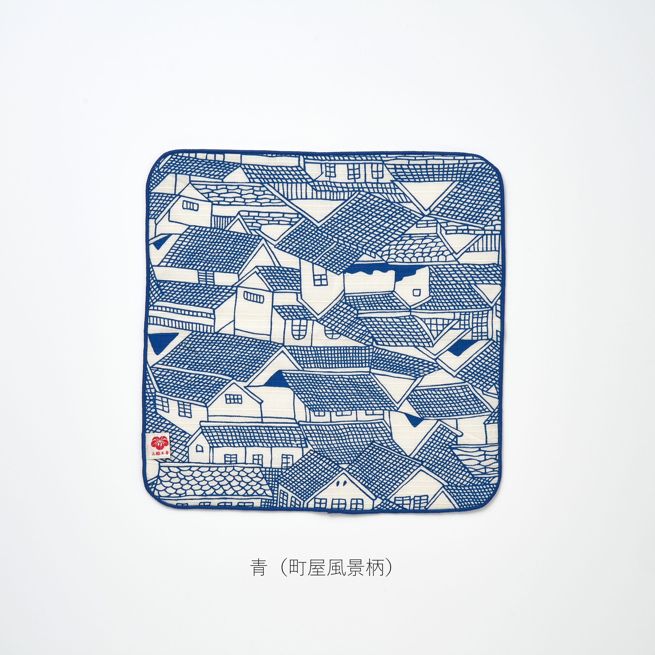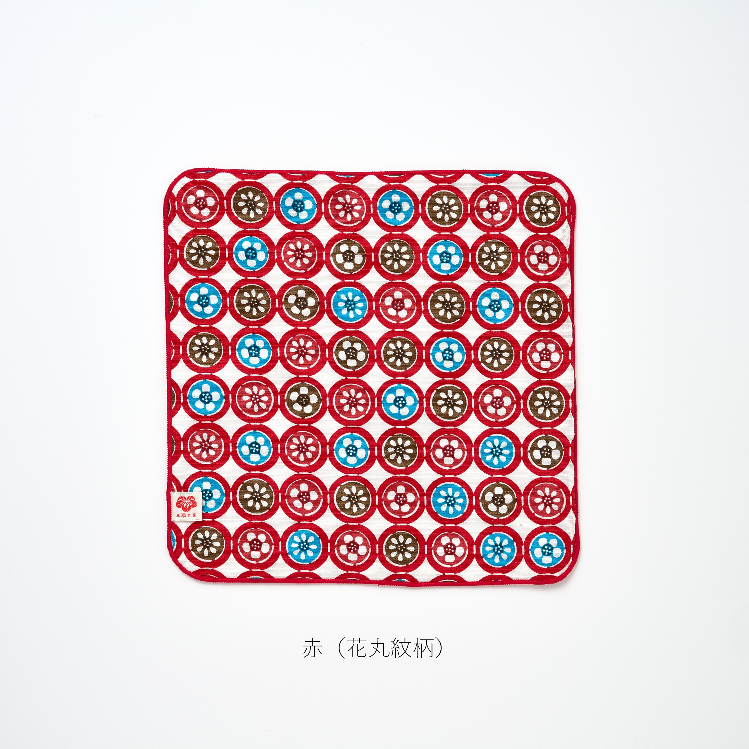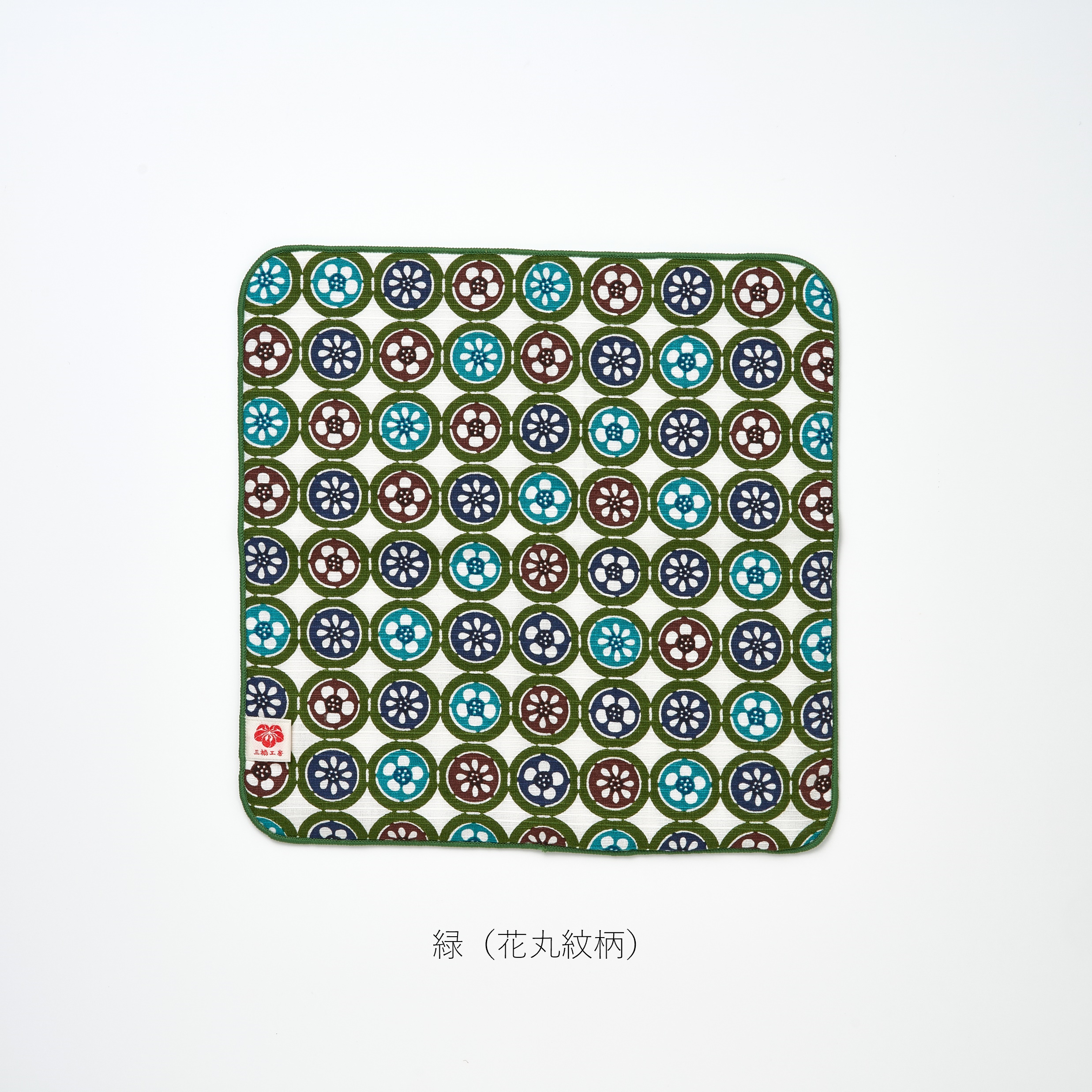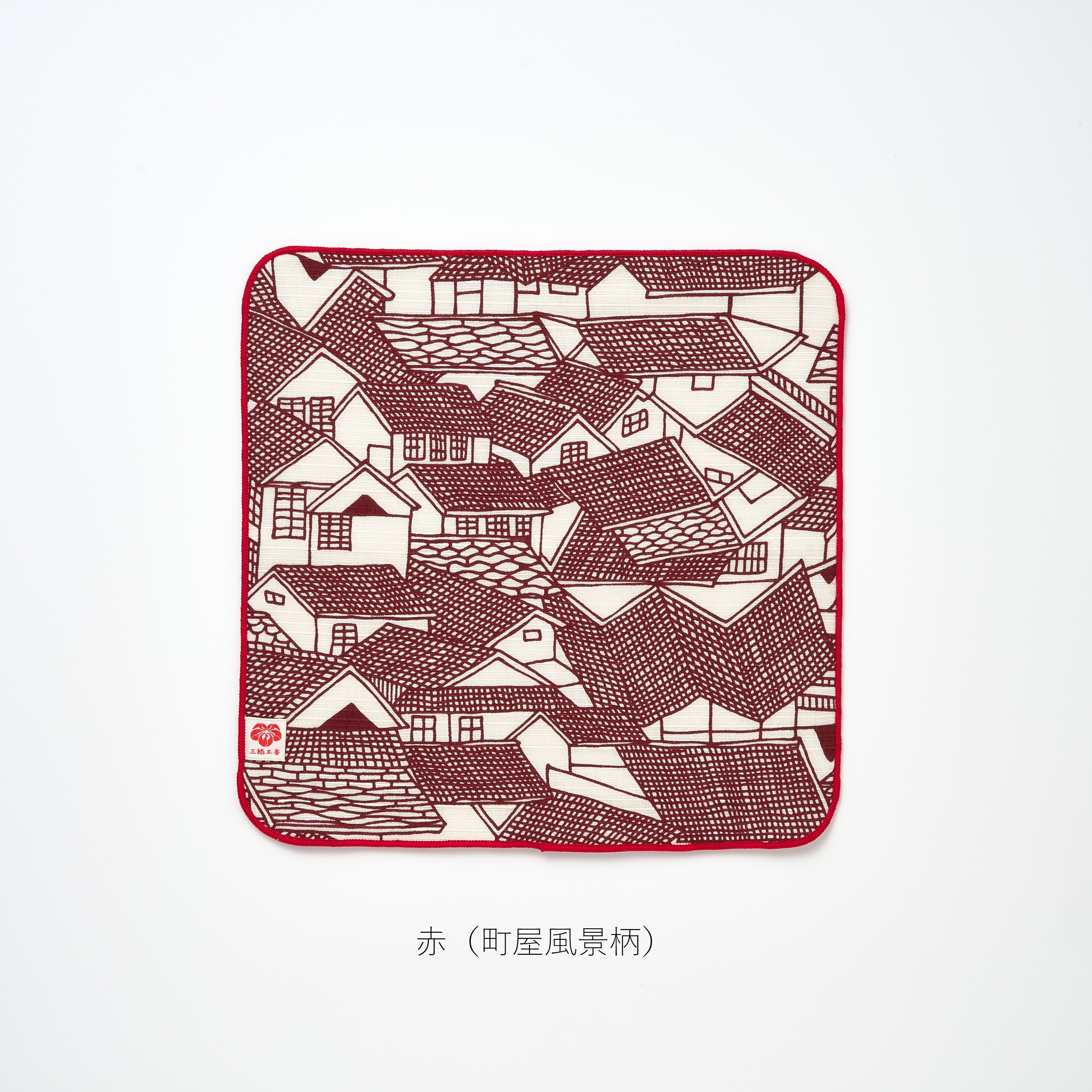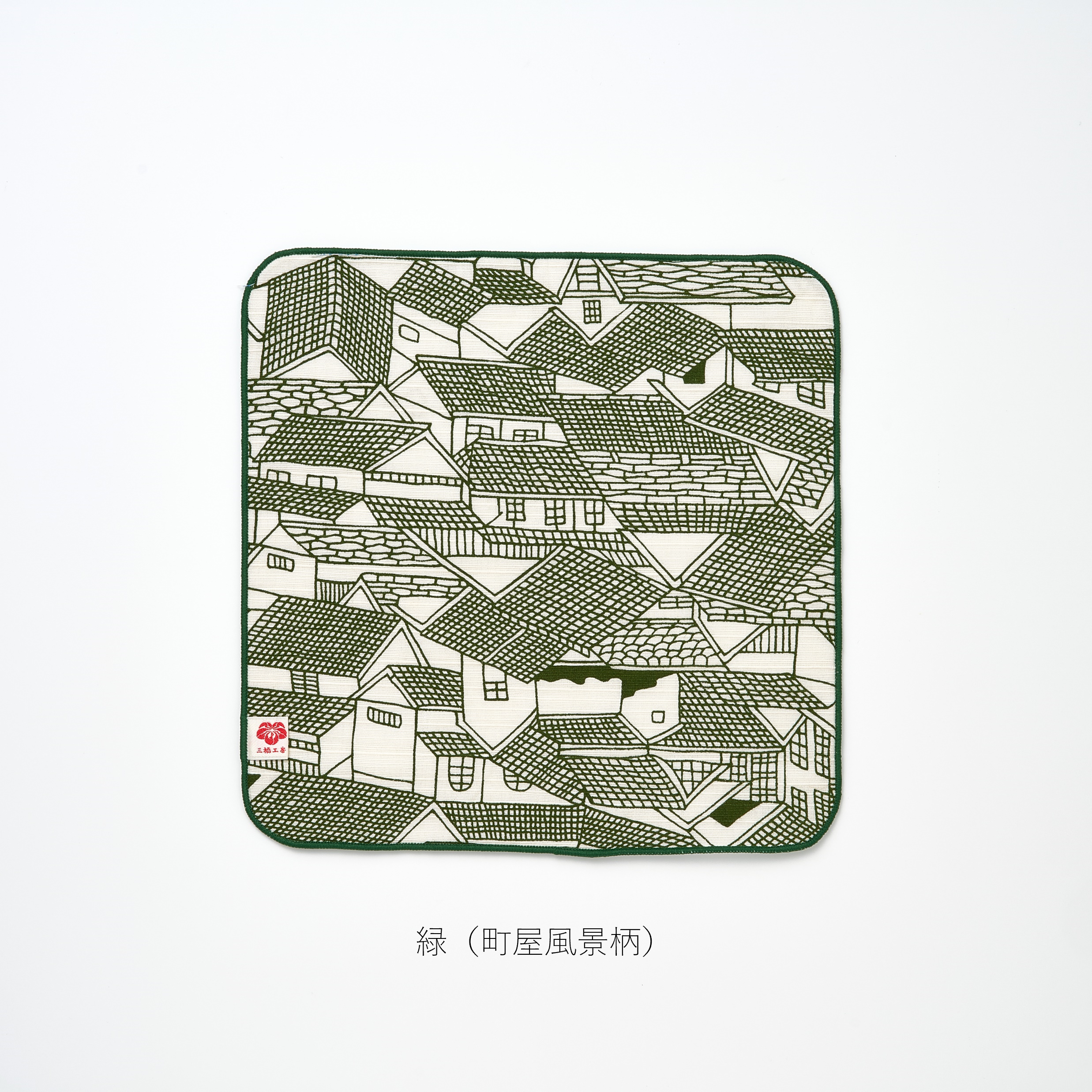 工房の伝統的な図柄を配した、上品で落ち着いた配色と親しみ易い柄行きのはんかちです。お品物を広げた大きさは約25cmでバッグやポケットにも入り、持ち運びにも便利です。柄の種類は「万事丸くおさまる」縁起の良い意味を持つ、江戸の粋を感じる「花丸紋」柄。古き良き日本家屋を上へ下へと個性的に描き配した、大正モダンの雰囲気「町屋風景」柄。お品物は表地に図柄を配置して裏地は白地になっており、各々赤・青・緑の3色展開です。