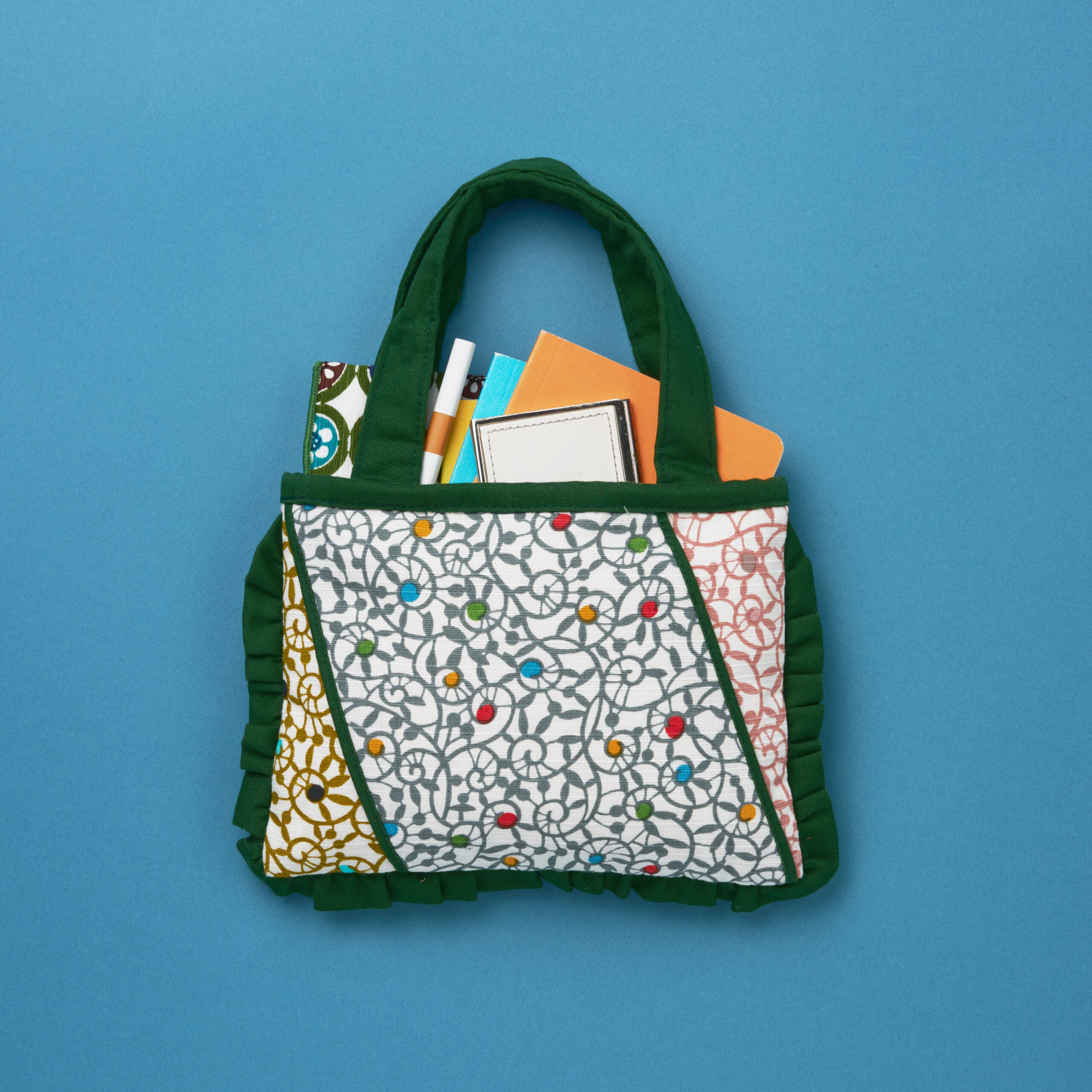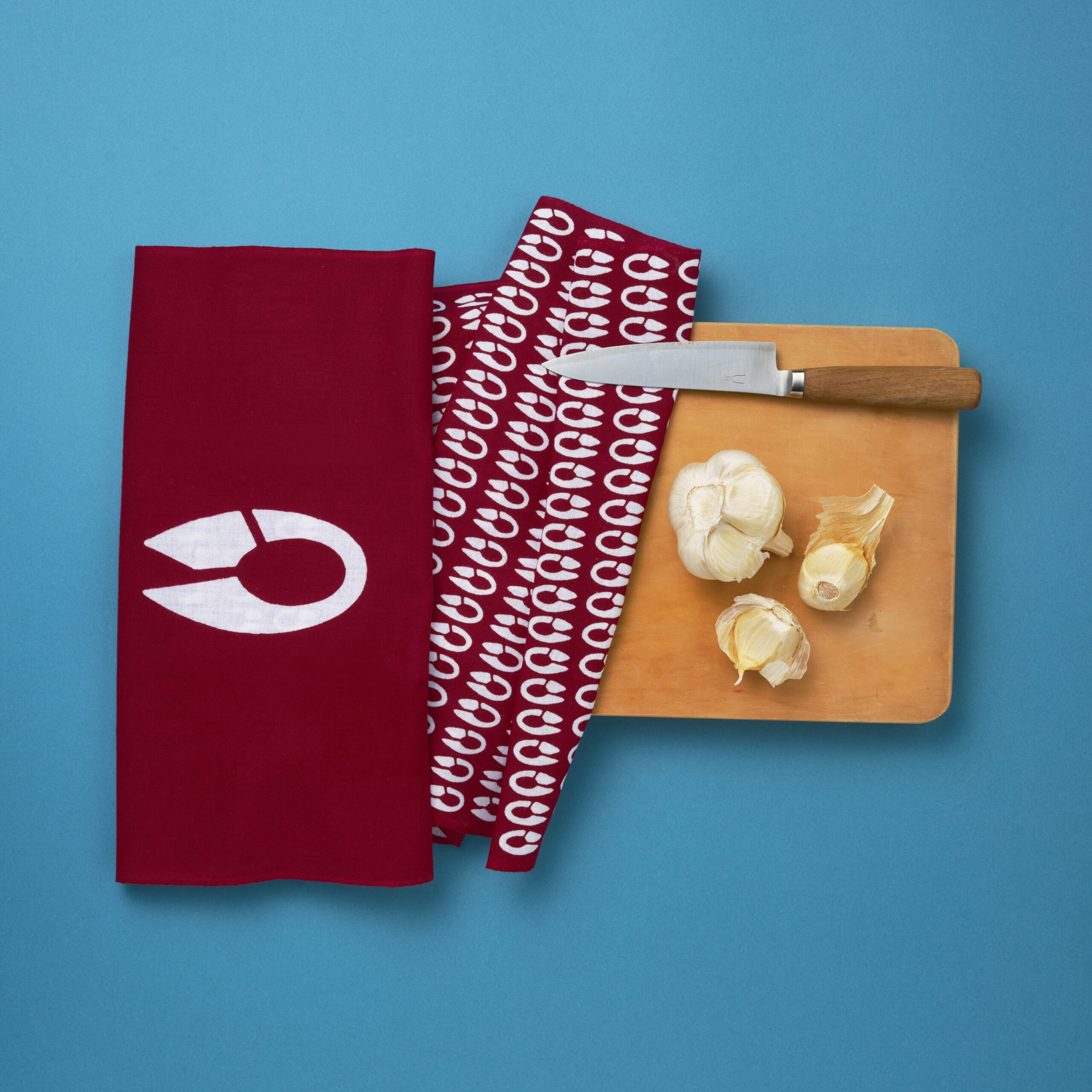カフェエプロンや巾着、トートバッグなど、日常のライフスタイルの中に自然に溶けこむ型小紋の雑貨も展開。そのモダンな柄とデザインにはファンも多い。