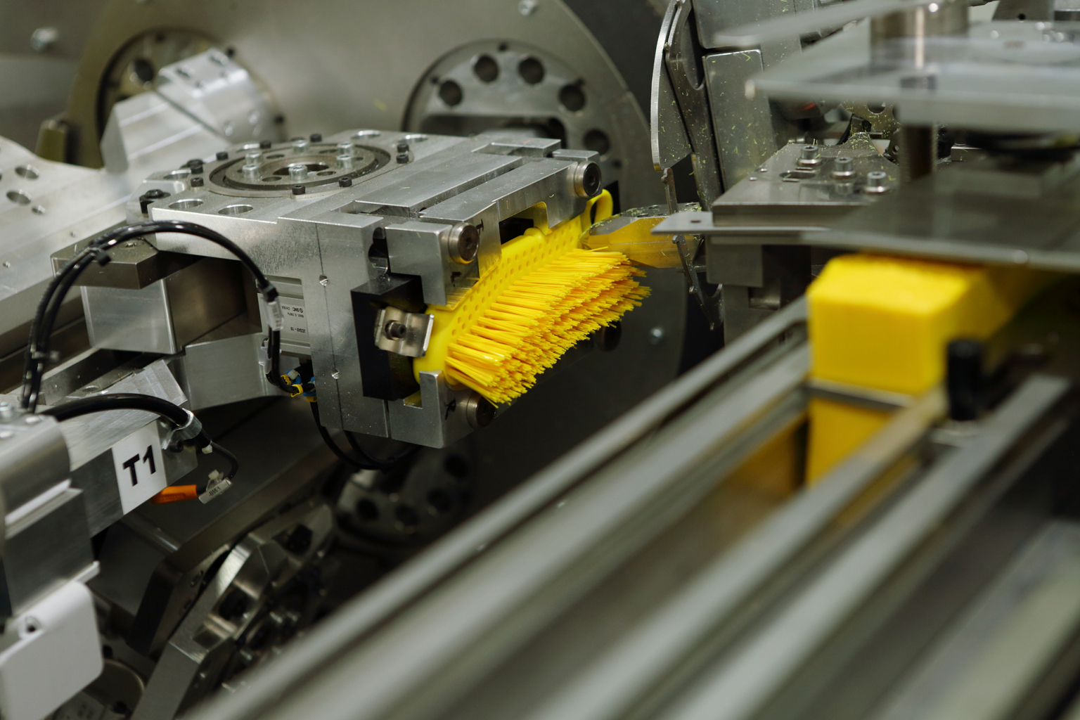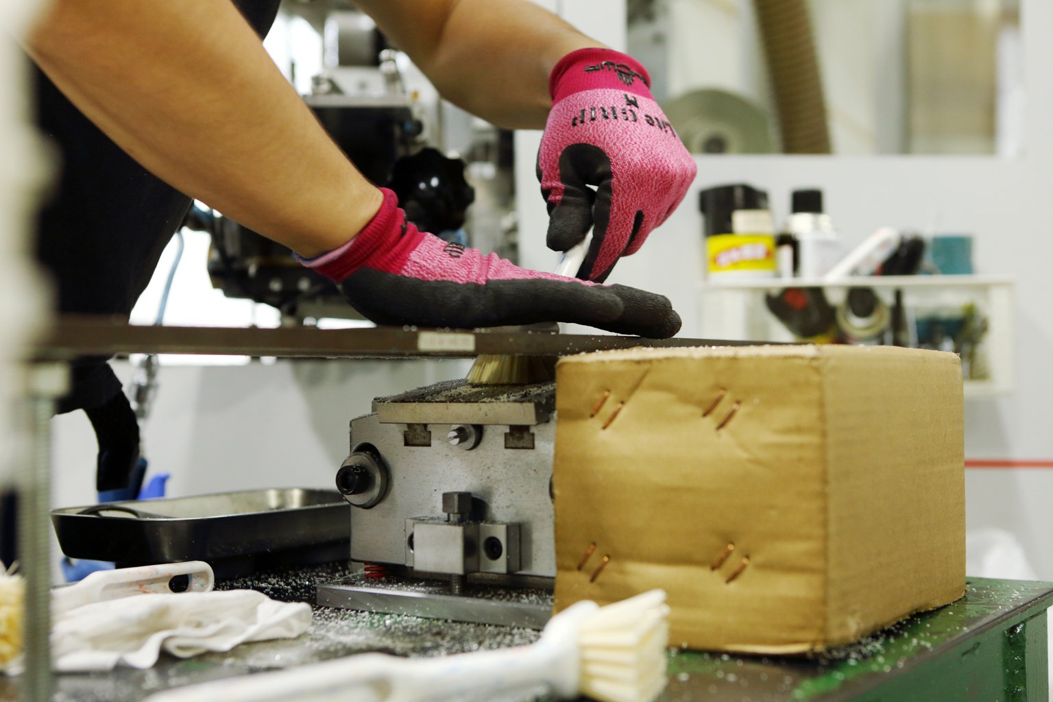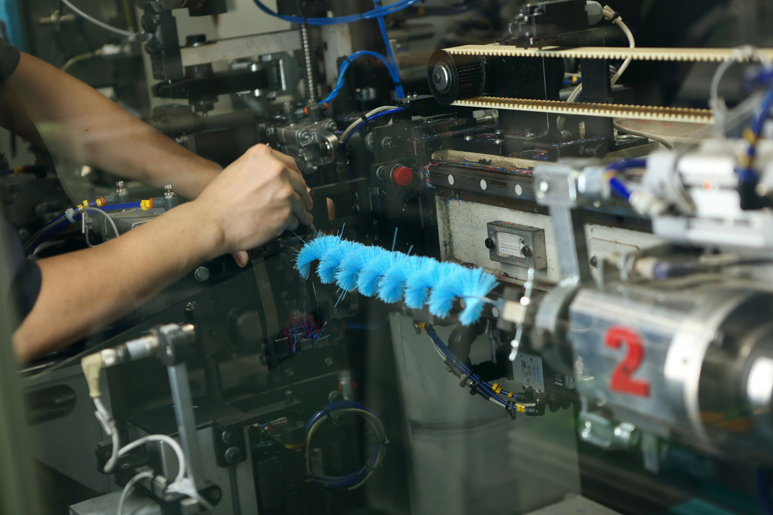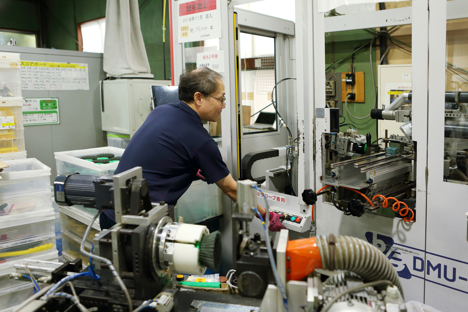 次に行ったのが、外部工場と連携したものづくり体制を見直し、自社工場で業務用ブラシの製造体制を強化すること。そんな決意の表れとして、吉田さんは「崖から飛び降りる覚悟で」、ブラシの台座に一本いっぽん毛を植え込むヨーロッパ製の植毛機械を導入する。