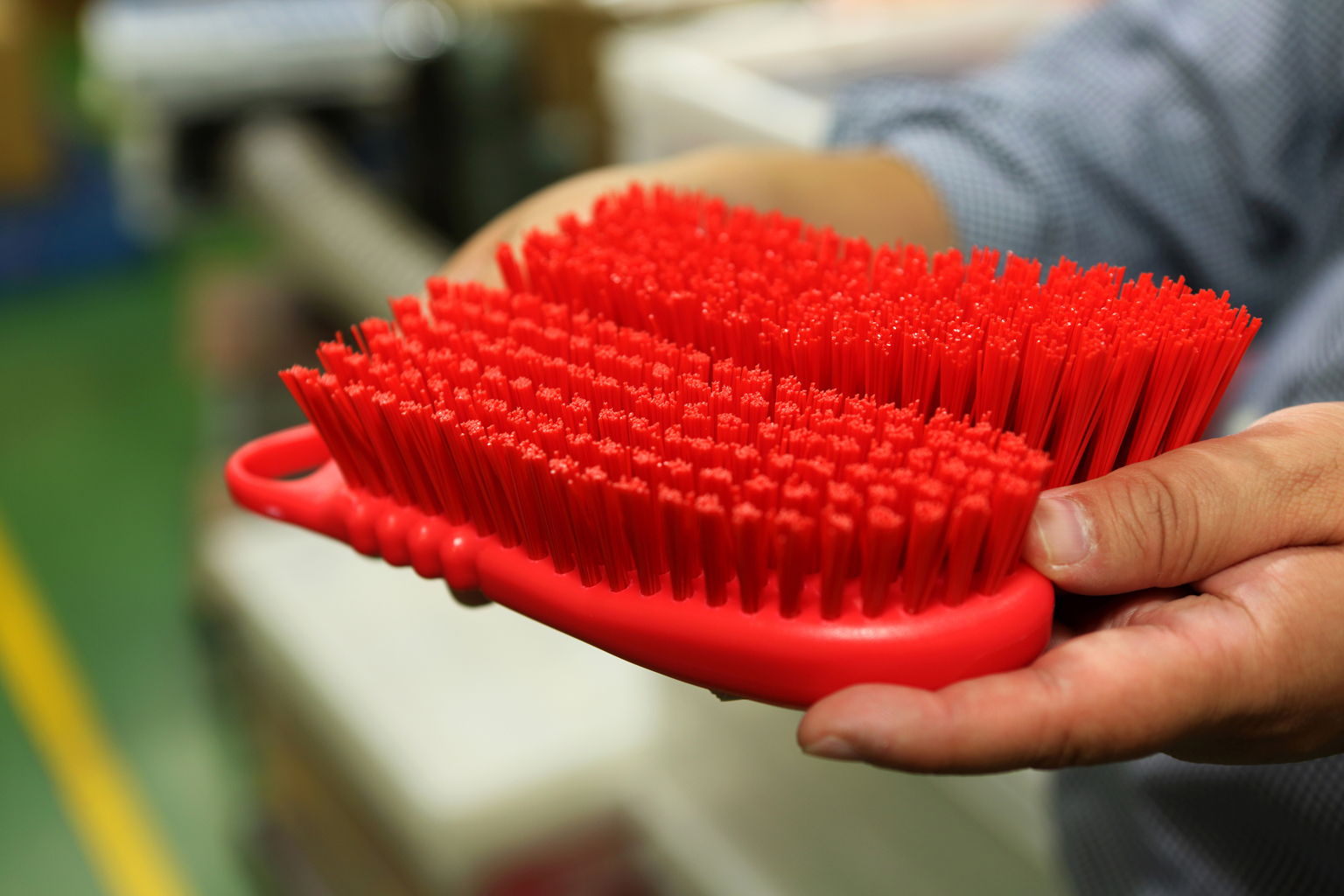 この工場で生産されている主力商品が、HACCP・異物混入対策を強化したブラシ「HP・HPMシリーズ」だ。日本人の体型に合わせたサイズ感と軽量のボディ、そしてオリジナルで開発した特殊毛材による洗浄力を兼ね備え、1日2時間・3カ月間の使用が可能な高い耐久性を有している。