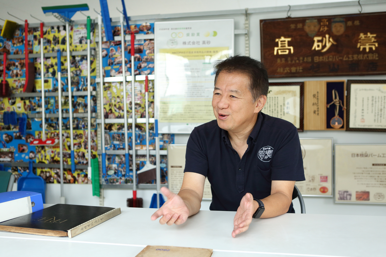 創業当時のいきさつを語る、株式会社高砂の4代目社長・吉田典靖さん。背後には社名の由来となった、自社製ほうきの商標「高砂箒」の歴史を感じさせる看板が。