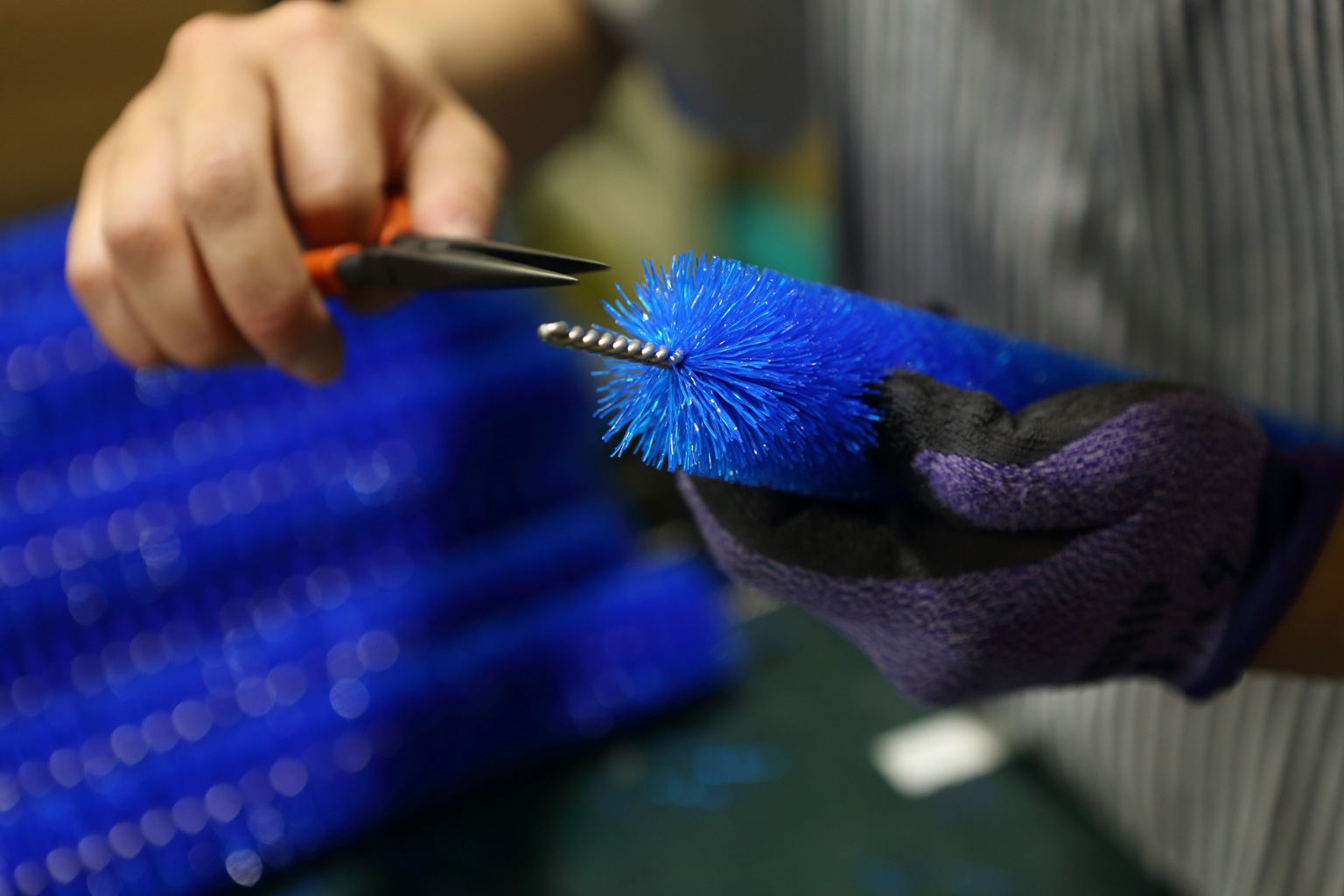 たわしやパイプブラシの製造では、針金を使ったねじり式の植毛を行う。針金をひねって毛材を巻きつけ、らせん状に成形した後、毛の長さを均一にカットする。