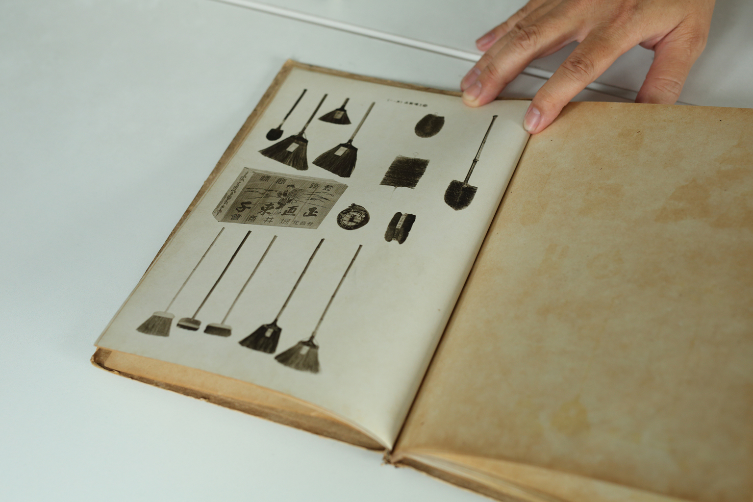 古い資料に残る、創業時につくられていた製品の写真。戦時中の物資が少ない時期も、配給をやりくりしながら椰子の繊維を使った庭ほうきやたわしを製造していたそうだ。