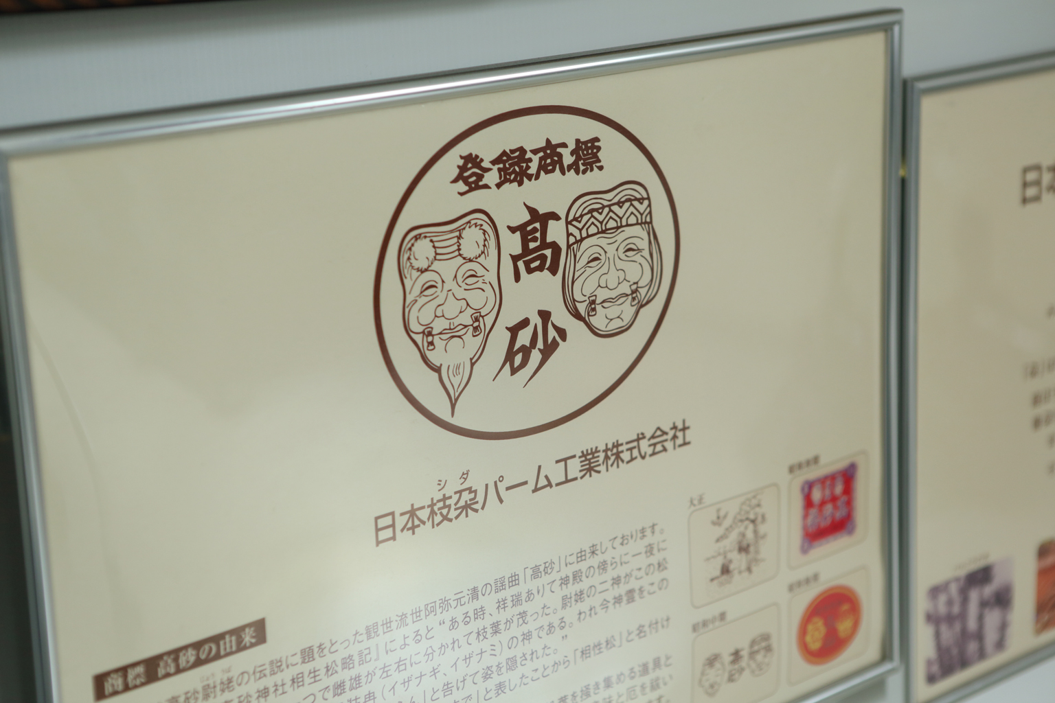 大正初年にデザインされた高砂の商標。世阿弥の謡曲「高砂」に由来し、長寿や夫婦円満などの象徴として、古くから縁起のよいものとされてきた。
