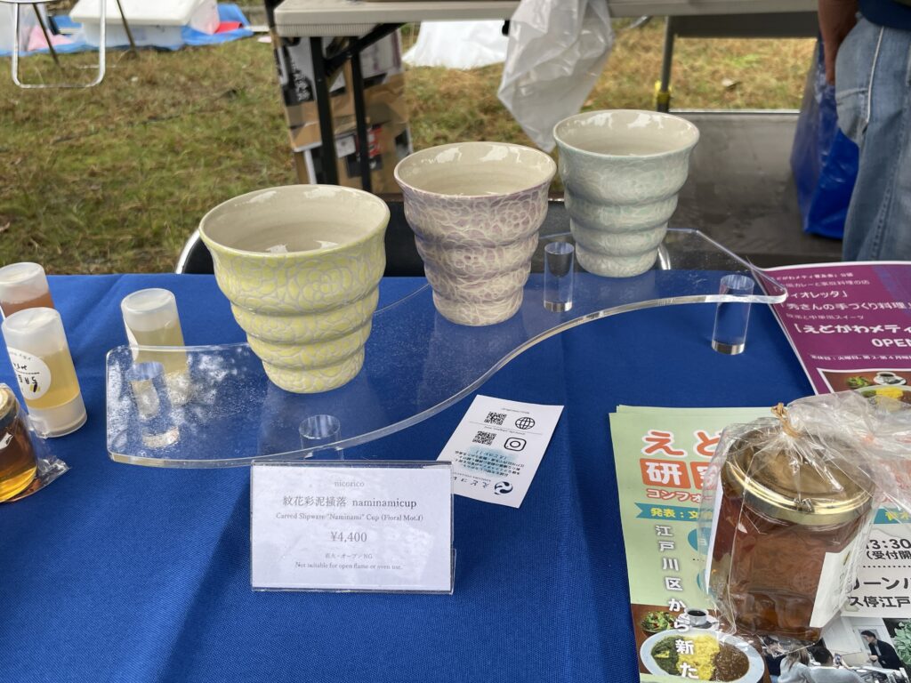 同じく、今回販売した「甲和焼 芝窯(こうわやき れいしよう)・nicorico」の商品「紋花彩泥掻落naminami cup」は、美しい花模様が特徴の新作カップです。