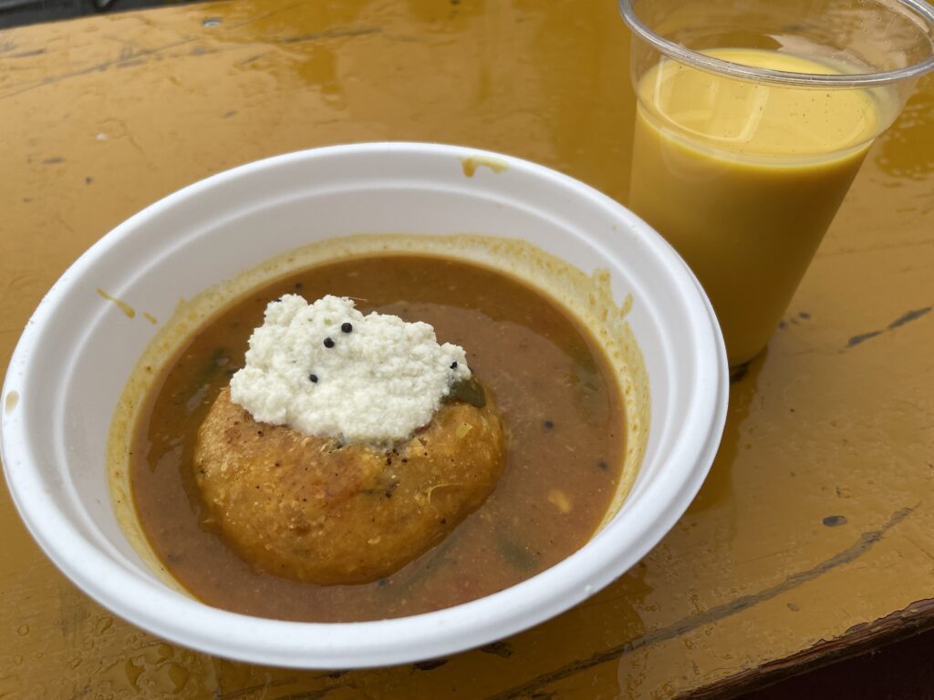 インドの軽食「ワダ・サンバル」。甘くないドーナツのようなじゃがいも味のする「ワダ」に、ピリッと辛いカレースープの味が染みて、寒い日にはうってつけ。