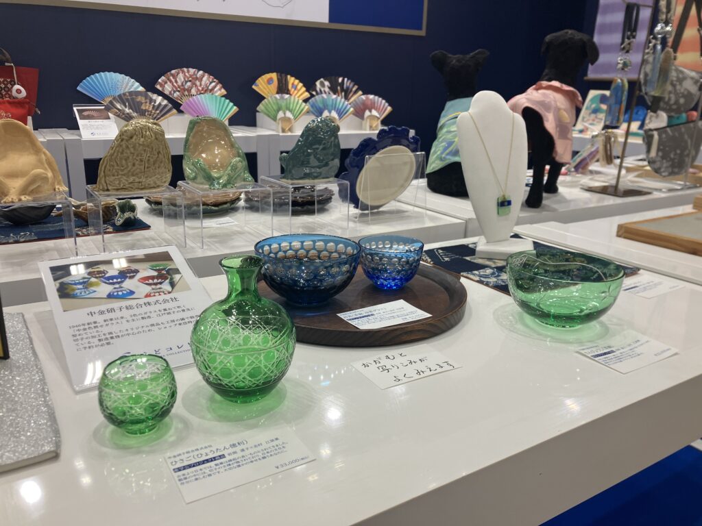 手作りのポップが目を引いた、中金硝子総合のガラス食器。中央の青い器「月光」は、令和7年度産学公プロジェクトにおいて「えどがわ賞」を受賞した。