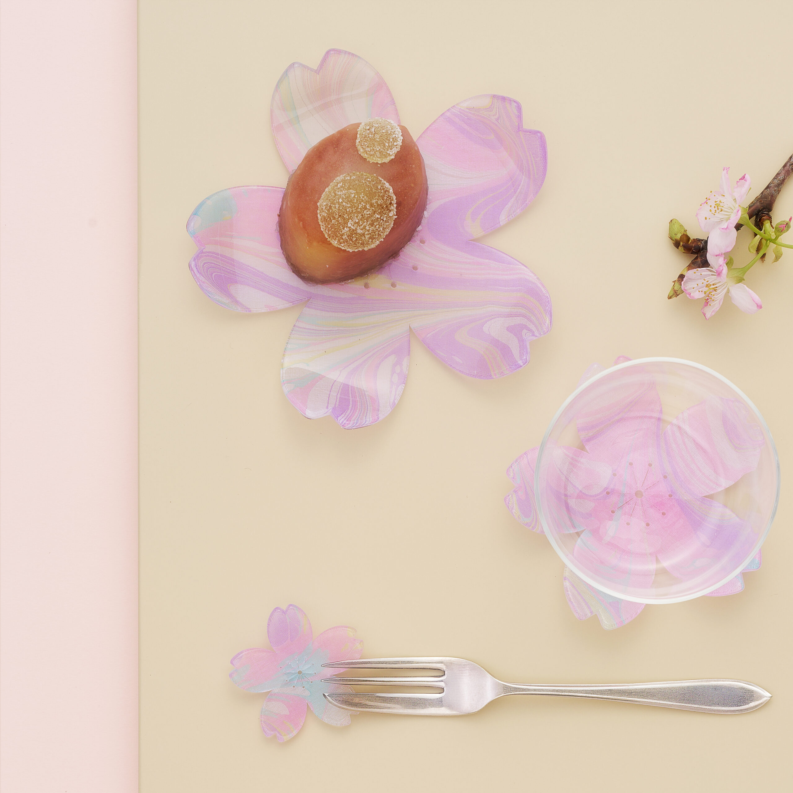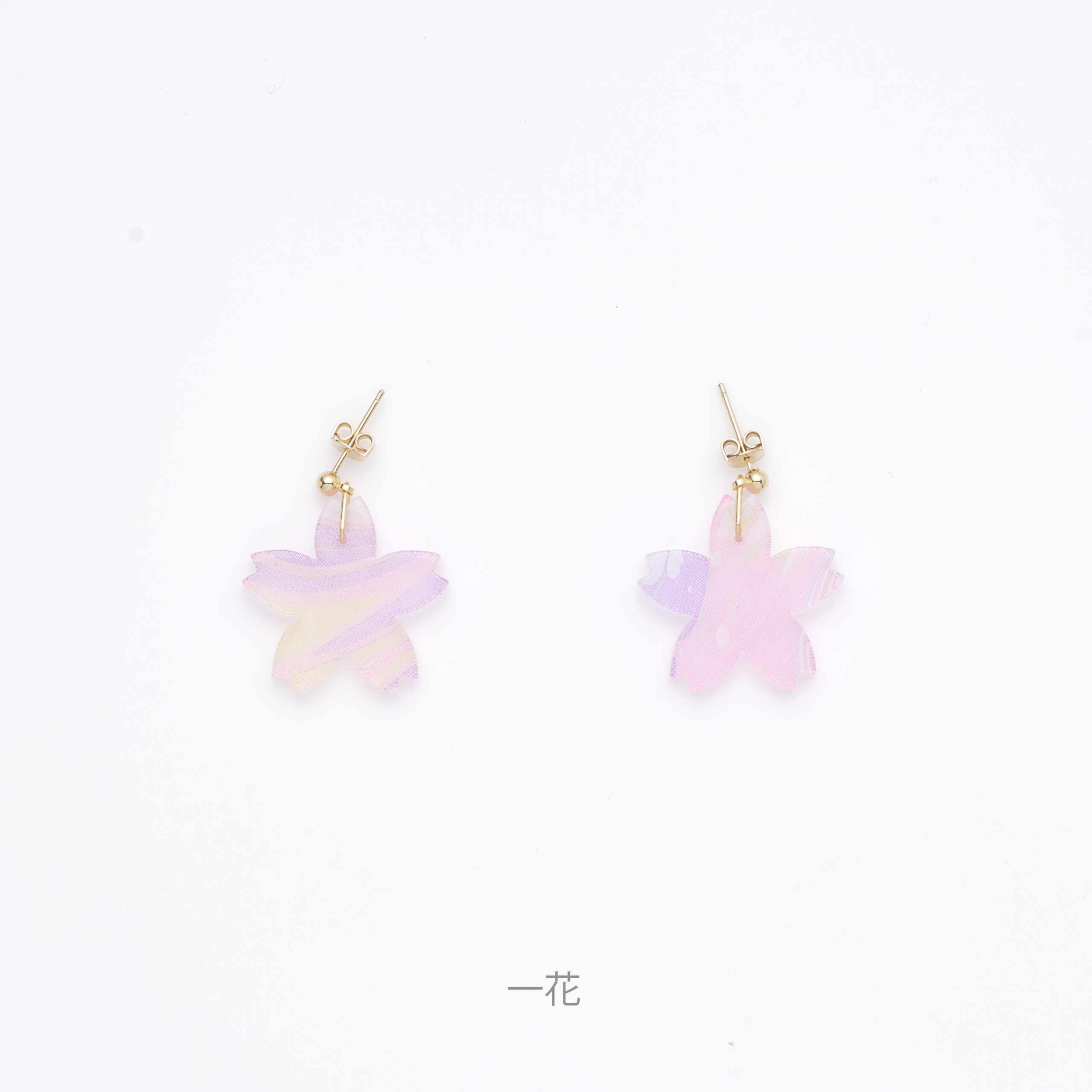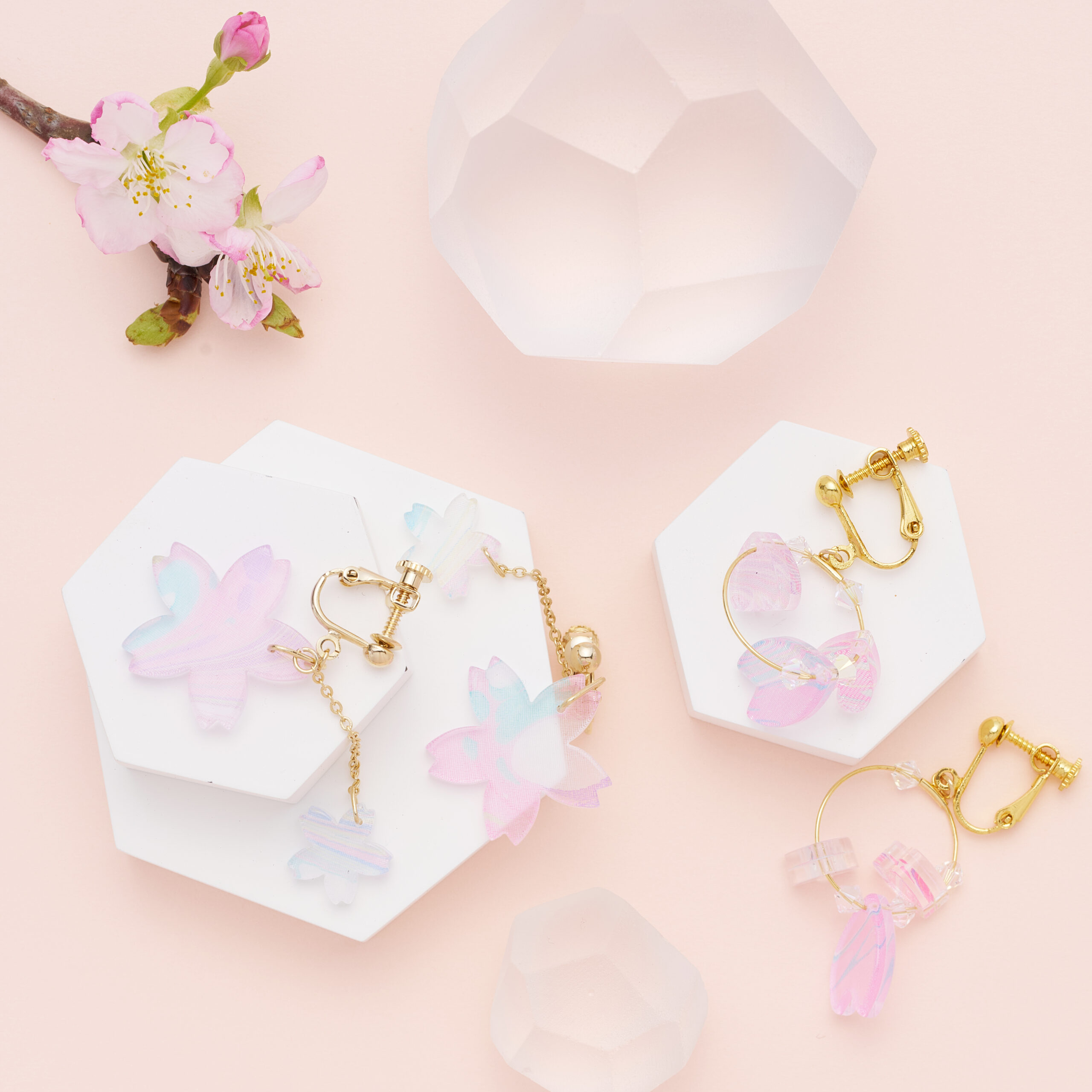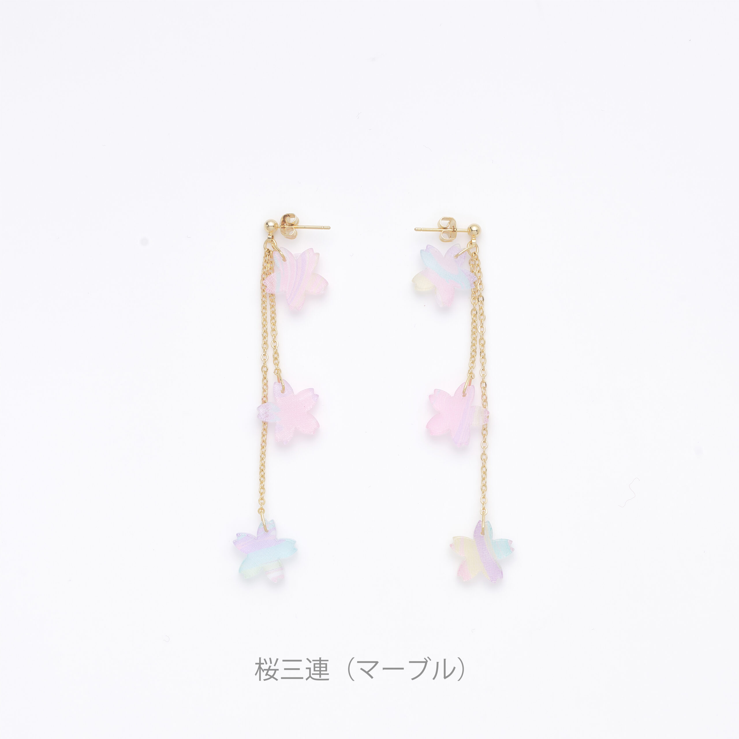 墨流し染め生地をアクリルで挟み、デザインやサイズの違う桜とビーズをあしらった唯一無二のアクセサリー。春の柔らかな日差しを受けて、耳元を甘くきらめかせます。※こちらはピアスです。