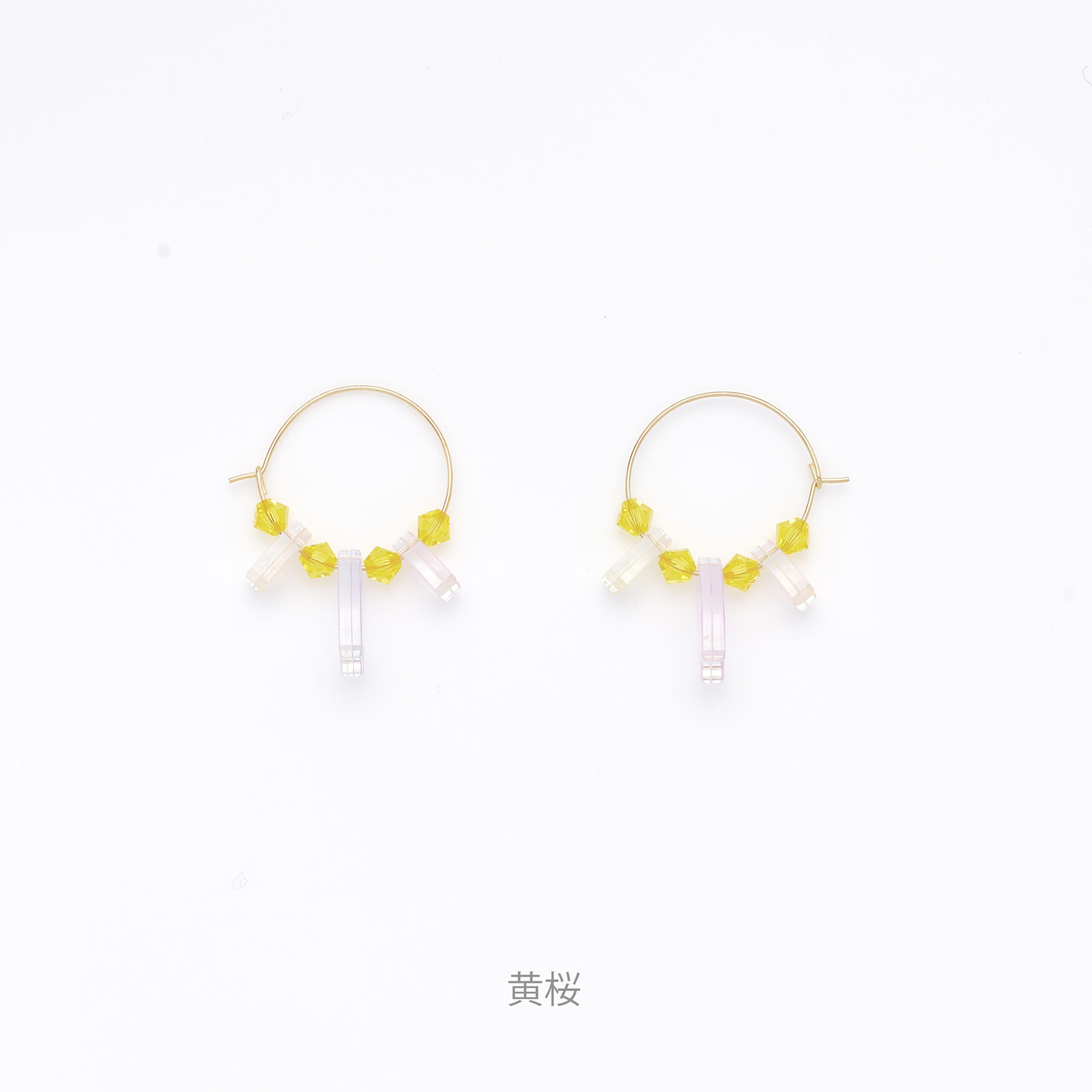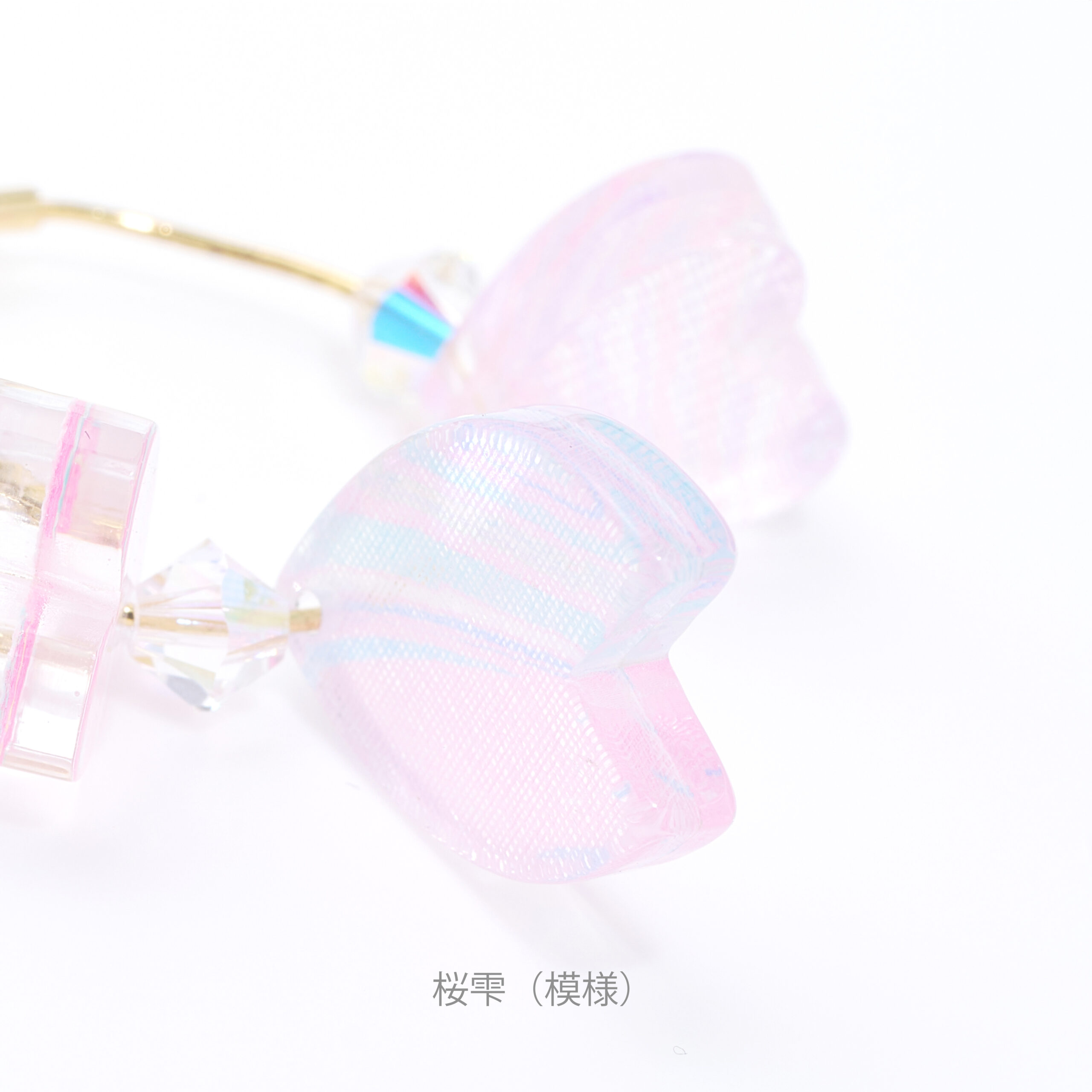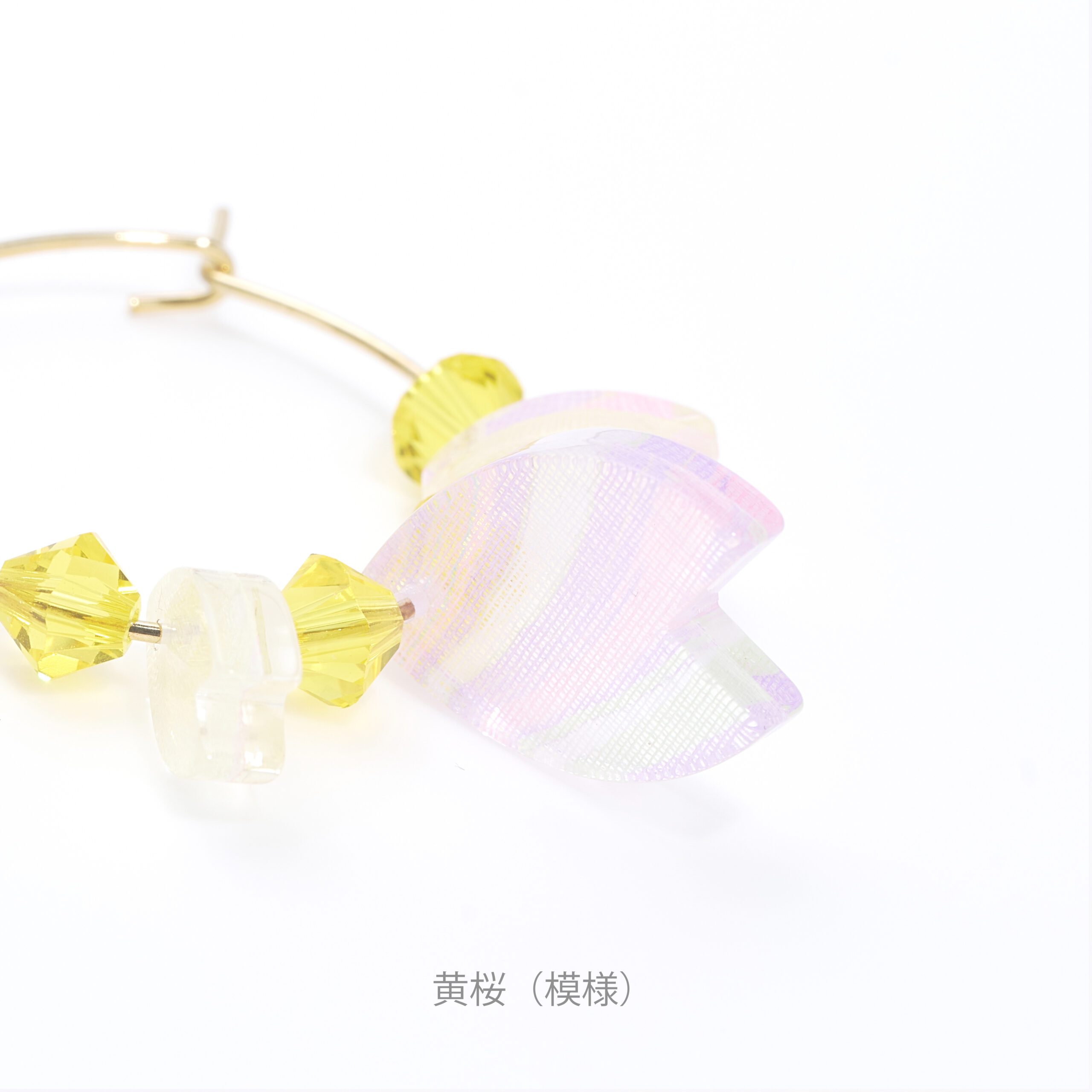 墨流し染め生地をアクリルで挟み、デザインやサイズの違う桜とビーズをあしらった唯一無二のアクセサリー。春の柔らかな日差しを受けて、耳元を甘くきらめかせます。※こちらはピアスです。